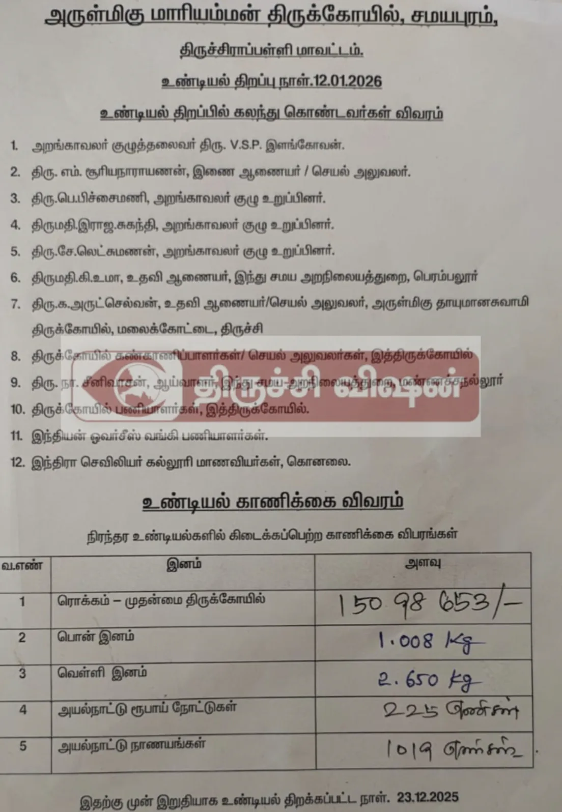 திருச்சி மாவட்டத்தில் உள்ள பிரசித்தி பெற்ற சமயபுரம் மாரியம்மன் கோவிலில், பக்தர்கள் செலுத்திய உண்டியல் காணிக்கைகளை எண்ணும் பணி சமீபத்தில்…