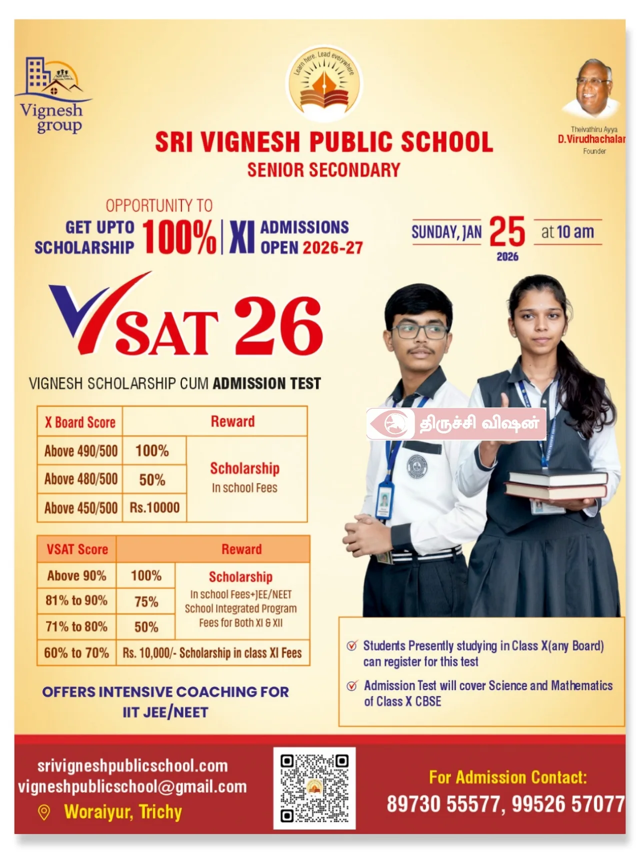 திருச்சி, உறையூர் பகுதியில் செயல்பட்டு வரும் ஸ்ரீ விக்னேஷ் பப்ளிக் ஸ்கூல் (Senior Secondary) சார்பில், 2026–27 கல்வியாண்டிற்கான 11ஆம்…