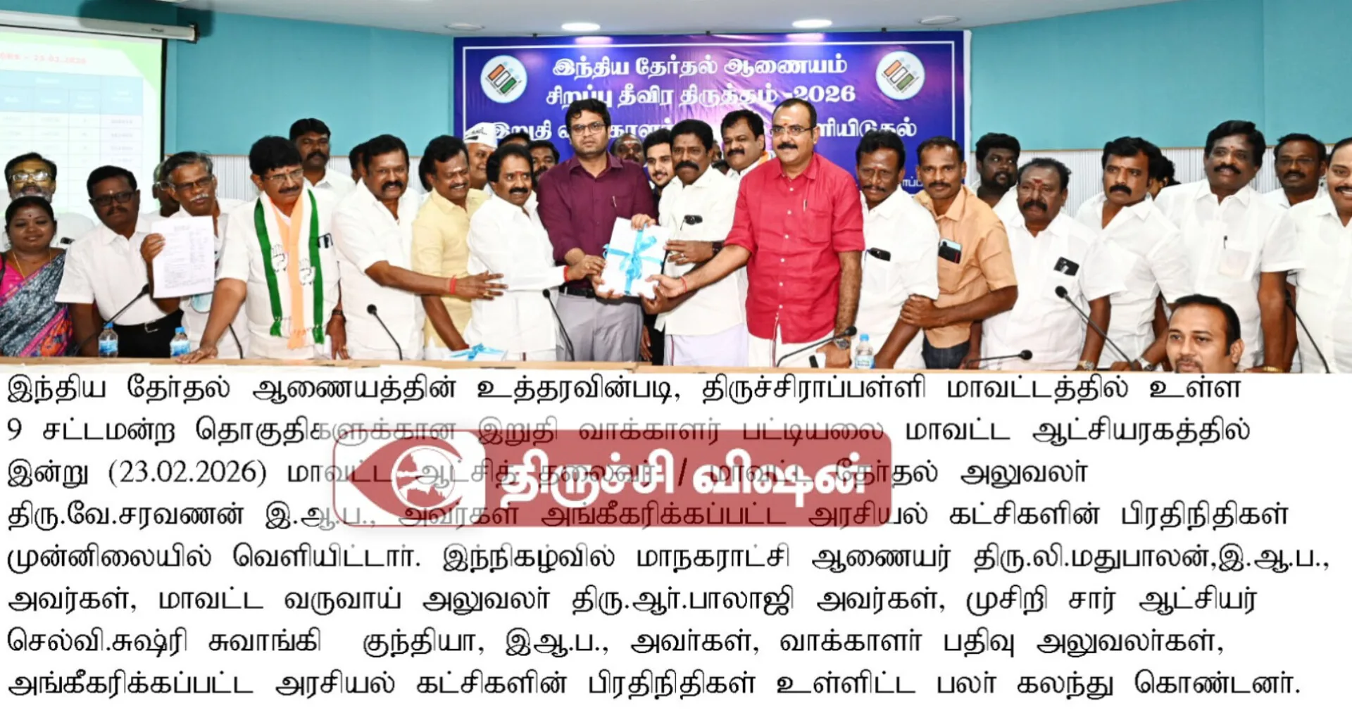இந்திய தேர்தல் ஆணையத்தின் உத்தரவின்படி, திருச்சிராப்பள்ளி மாவட்டத்தில் உள்ள 9 சட்டமன்ற தொகுதிகளுக்கான இறுதி வாக்காளர் பட்டியலை மாவட்ட ஆட்சியரகத்தில்…