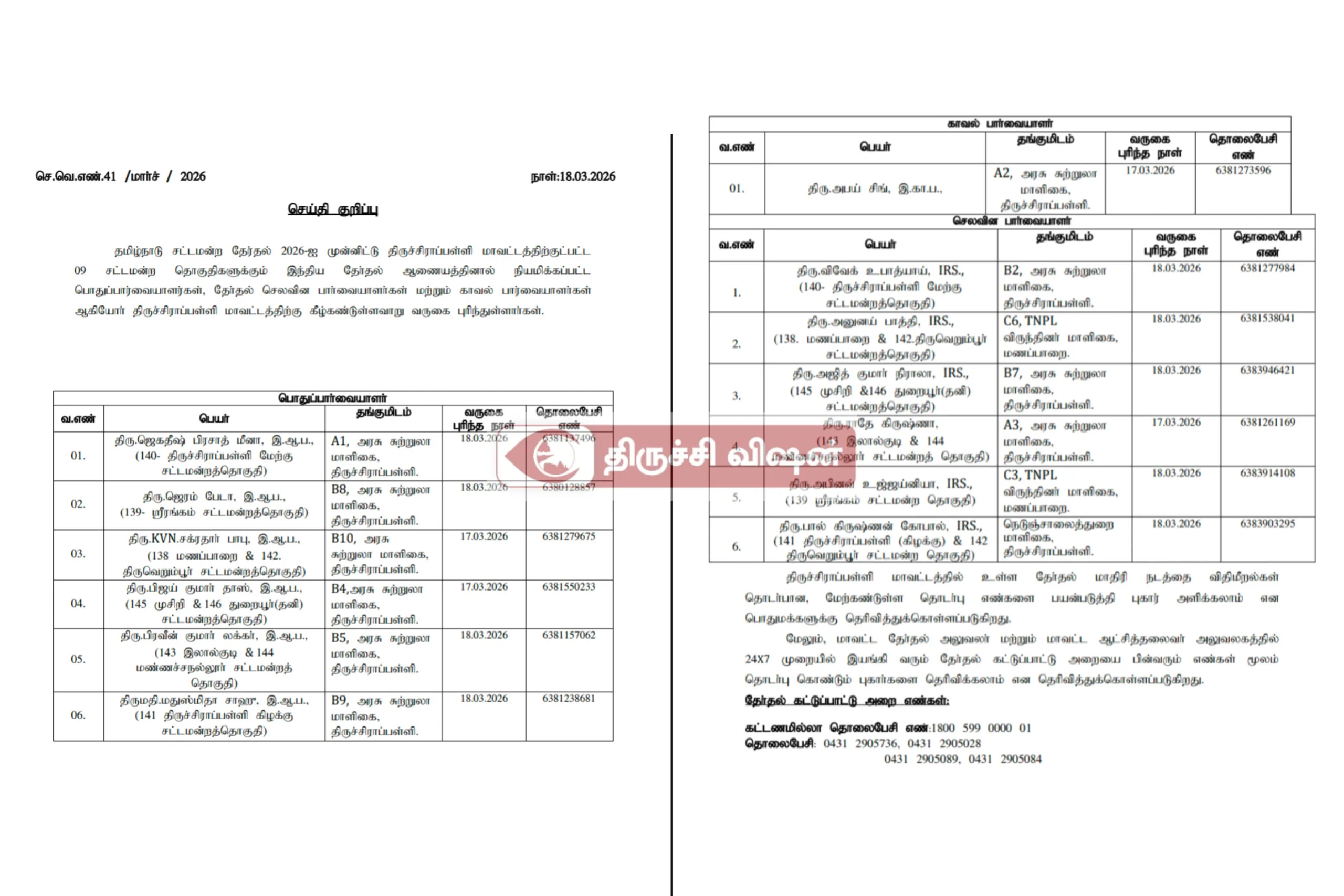 திருச்சி: 9 தொகுதிகளுக்கும் தேர்தல் பார்வையாளர்கள் வருகை – தொடர்பு எண்கள் அறிவிப்பு!