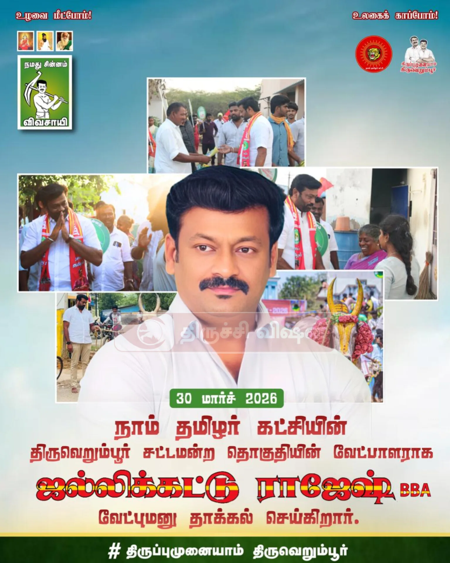 திருச்சி திருவெறும்பூர் தொகுதியில் நாம் தமிழர் கட்சி சார்பில் போட்டியிடும் வேட்பாளர் ஜல்லிக்கட்டு ராஜேஷ் காளை மாடுகள், செம்மறி ஆடு…