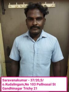 திருச்சி மாநகரில் வாகனத் திருட்டு அதிகரிக்கப்பட்டதையடுத்து மாநகர காவல் ஆணையர் லோகநாதன் உத்தரவின்பேரில் ஸ்ரீரங்கம் குற்றப்பிரிவு ஆய்வாளர் வாகன சோதனையில் ஈடுபட்ட பொழுது காவல்துறையினர் பார்த்து தப்பியோட முயற்சி செய்த சரவணகுமாரை விசாரித்துள்ளனர்.