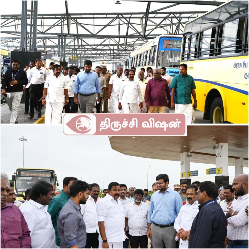 நகராட்சி நிருவாகத்துறை அமைச்சர் திரு.கே.என்.நேரு அவர்கள் இன்று (20.07.2025) திருச்சிராப்பள்ளி பஞ்சப்பூர் ஒருங்கிணைந்த பேருந்து முனையத்தின் செயல்பாடுகளையும், பேருந்துகளின் இயக்கங்களையும், பயணிகள் பயன்படுத்தும் வகையில்