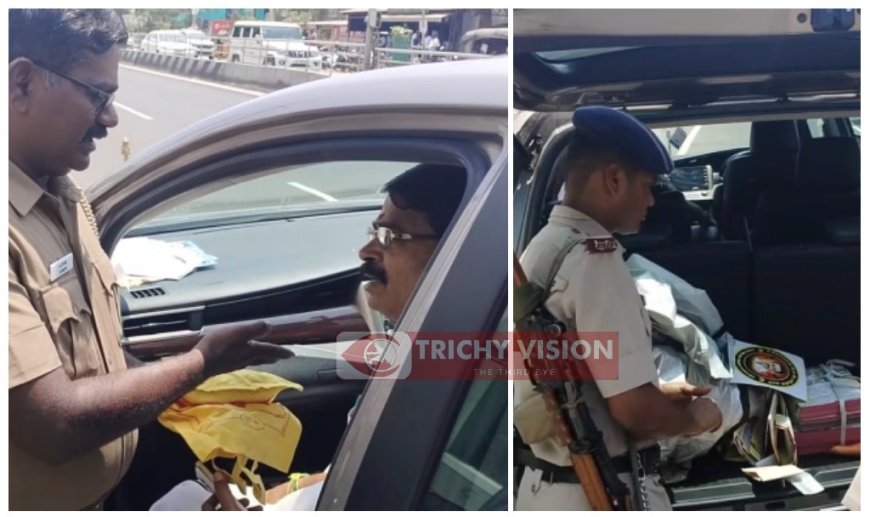 தொடர்ந்து தமிழகம் முழுவதும் தேர்தல் பறக்கும் படை அதிகாரிகள் 24 மணி நேரமும் வாகன சோதனையில் மேற்கொண்டு வருகின்றனர். இந்நிலையில் திருச்சி முழுவதும் சுமார் 17 வாகன சாவடி மையம் மூலம் தேர்தல் பறக்கும் படையினர் அதிரடி சோதனையில் ஈடுபட்டு வருகின்றனர். இதில் திருச்சி கருமண்டம் பகுதியில் அமைக்கப்பட்டுள்ள சோதனைச் சாவடியில் கூட்டுறவு சங்க சார்பதிவாளர் கௌசல்யா தலைமையிலான பறக்கும் படையினர் வாகன சோதனையில் ஈடுபட்டிருந்தனர்.