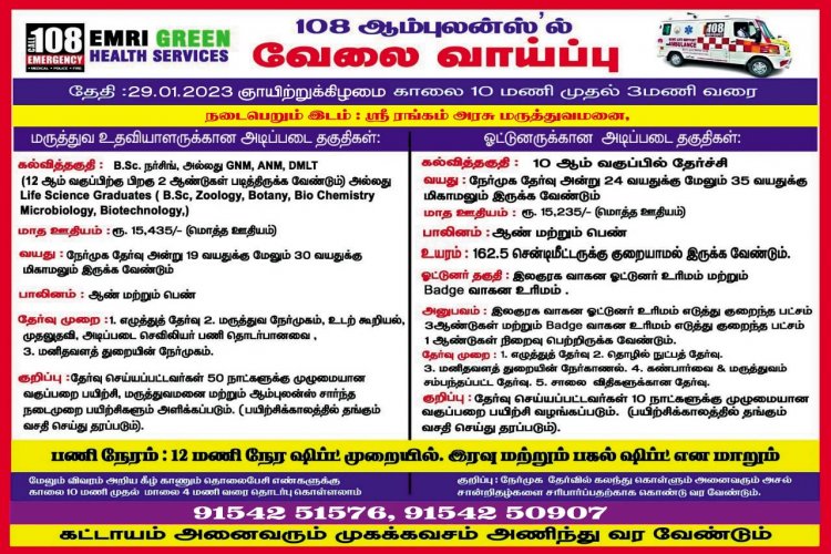 தமிழக அரசு, ஈ.எம்.ஆர்.ஐ., கிரீன் ஹெல்த் சர்வீசஸ் நிறுவனம், ஆம்புலன்ஸ் ஓட்டுனர்கள் மருத்துவ உதவியாளர்களுக்கான வேலை வாய்ப்பு முகாம் நடைபெற உள்ளது.