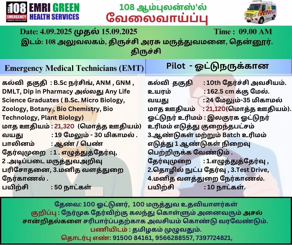 சென்னை: தமிழகத்தில் கட்டணமில்லா அவசர மருத்துவ சேவைகளை வழங்கும் 108 ஆம்புலன்ஸ் சேவை, ஓட்டுநர்கள் மற்றும் அவசரகால மருத்துவ உதவியாளர் பணியிடங்களுக்கான வேலைவாய்ப்பு முகாம்களை நடத்தவுள்ளது. EMRI GREEN HEALTH SERVICES என்ற நிறுவனத்துடன் இணைந்து தமிழ்நாடு சுகாதாரத் திட்டத்தின் கீழ் இந்த சேவை செயல்படுத்தப்பட்டு வருகிறது.