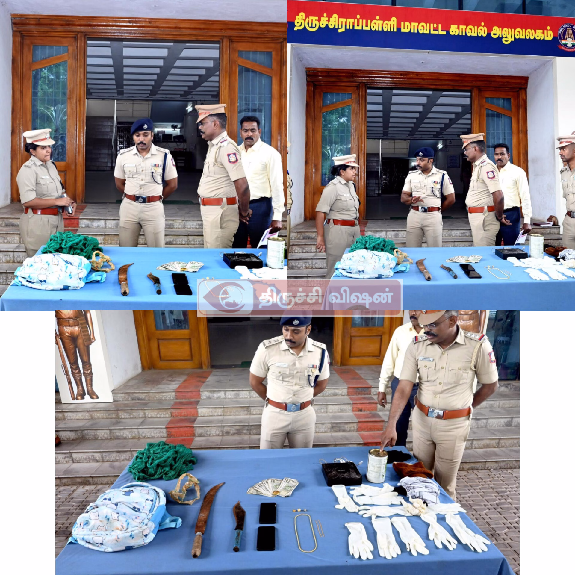 மேற்படி குட்டி (எ) சங்கப்பிள்ளை (23), த/பெ. ஆறுமுகம், தெற்கு தெரு, புத்தாநத்தம் என்பவரை நிலையம் அழைத்து வந்து விசாரணை மேற்கொண்டதில், தான் மற்றும் தனது கூட்டாளிகளான (1) ஹரிஹரன், அரியாணிப்பட்டி, (2) பாலமுருகன், கொட்டாம்பட்டி, (3) ஸ்ரீராம், கொட்டாம்பட்டி, (4) அரவிந்த், கொட்டாம்பட்டி, (5) கரண்குமார், காளப்பட்டி கோவை, (6) முகேஷ் குமார், காளப்பட்டி கோவை, (7) சுபாஷ் சந்திரபோஸ், மடபுரம், (8) அழகேசன், குளத்துப்பட்டி, (9) தர்மராஜ், கருமலை, (10) நவநீதகிருஷ்ணன் (எ) ராஜ்குமார், நல்லகண்டம் ஆகியோருடன் சேர்ந்து 08.04.2025 மற்றும் 06.08.2025 ஆகிய தேதிகளில் துவரங்குறிச்சி மற்றும் புத்தாநத்தம் பகுதிகளில் கொள்ளை சம்பவங்களில் ஈடுபட்டதை ஒப்புக்கொண்டார். கொள்ளை சம்பவத்தின்போது கொள்ளையடித்த வீட்டில் இருந்த நாய்களுக்கு விஷம் கலந்த மாமிச பொருள் கொடுத்ததையும் ஒப்பு கொண்டுள்ளனர். அதன் பேரில் மேற்படி அனைத்து எதிரிகளையும் கைது செய்து நிலையம் அழைத்து வந்து அவர்கள் துவரங்குறிச்சி கொள்ளை வழக்கில் கொள்ளையடித்த 6 சவரன் தங்க நகைகள், ஒரு இணை வெள்ளி கொலுசு மற்றும் கொள்ளைக்கு பயன்படுத்திய 2 இரு சக்கர வாகனங்கள், ஆகியவற்றையும், புத்தநத்தம் கொள்ளை வழக்கில் கொள்ளையடித்த 1/2 பவுன் தங்க தோடு, ரூ. 25,000/- ரொக்கம் ஆகியவை கைப்பற்றப்பட்டது.