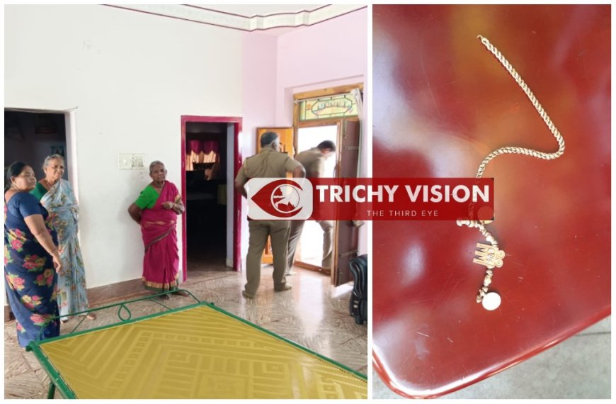 அப்போது பின்பக்க வழியாக மூன்று மர்ம நபர்கள் பட்டாக்கத்தியுடன் வந்து ஜோதிமணி மற்றும் கோபாலகிருஷ்ணன் கழுத்தில் கத்தியை வைத்து மிரட்டி உள்ளனர். மேலும் கவிதா அணிந்திருந்த 11 சவரன் நகையை பறித்துக்கொண்டு சென்று விட்டனர். இது குறித்து துறையூர் காவல் நிலையத்தில் கோபாலகிருஷ்ணன் புகார் அளித்துள்ளார்.