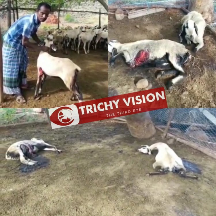 திருச்சி மாவட்டம் முசிறி தாலுக்கா தா.பேட்டை அருகே அமைந்துள்ள தேவனூர் புதூர் கரடு பகுதியில் வசித்து வருபவர் இளங்கோவன். இவர் ஆடுகள் வளர்த்துபிழைப்பு நடத்தி வருகிறார். இவரது வீடு அப்பகுதியில் உள்ள சிறு கரடு அடிவாரத்தில் அமைந்துள்ளது. வீட்டின் அருகிலேயே இவர் வளர்க்கும் ஆடுகளை பட்டி அமைத்து பாதுகாத்து வருகிறார்.