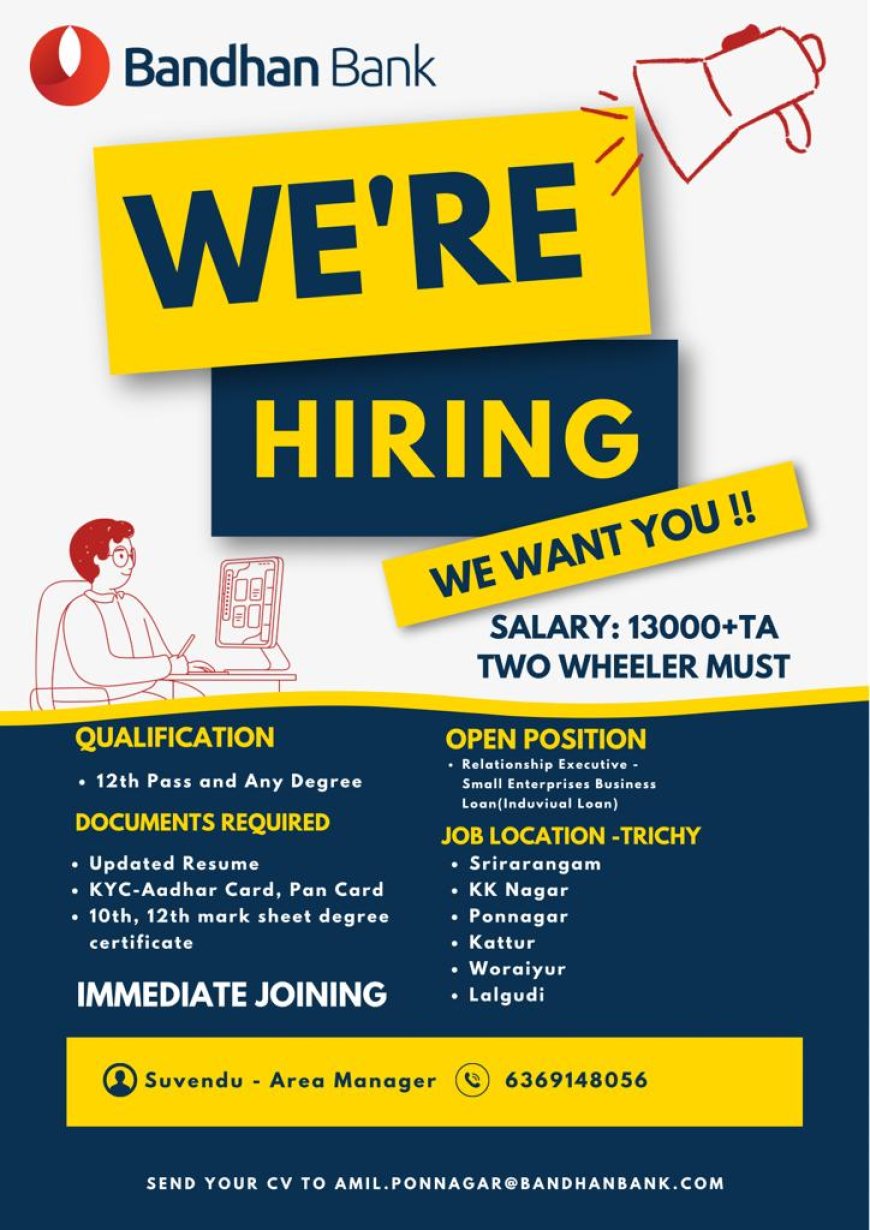 திருச்சியில் செயல்பட்டு வரும் பிரபல Bandhan வங்கியில் பல்வேறு பணியிடங்களுக்கு வேலை வாய்ப்புகள் அறிவிக்கப்பட்டுள்ளன. வரும் (02.03.2024) சனிக்கிழமை அன்று நேர்காணல் நடைபெற உள்ளது. மேலும் விவரம் மற்றும் தொடர்புக்கு கீழ உள்ள படத்தை பார்க்கவும்.