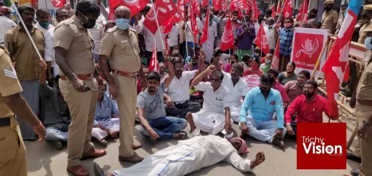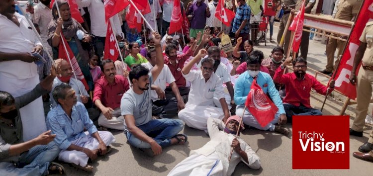 திருச்சி தெப்பக்குளம் தபால் நிலையம் அருகே இந்திய கம்யூனிஸ்ட் கட்சி சார்பில் கொரோனா ஊரடங்கில் வாழ்வாதாரத்தை இழந்து தவிக்கும் தரைக்கடை வியாபாரிகளுக்கு பத்தாயிரம் ரூபாய் ஸ்வான் நிதி வழங்கப்படும் என மத்திய அரசு அறிவித்தும் வழங்காததை கண்டித்தும் மறியல் போராட்டம் நடைபெற்றது.