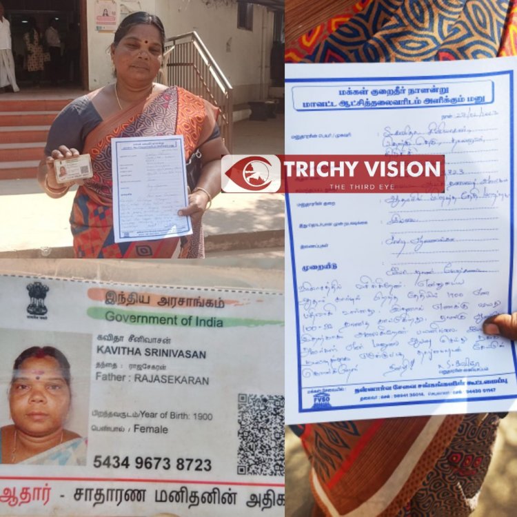 திருச்சி மாவட்ட ஆட்சியர் அலுவலகத்தில் இன்று நடைபெற்ற குறைதீர்க்கும் நாள் கூட்டத்தில் தாயனூரைச் சேர்ந்த கவிதா மனு அளித்தார். அந்த மனுவில் தனது வாக்காளர் அடையாள அட்டையில் 03.05.1982 என எனது பிறந்த தேதி குறிப்பிட்டுள்ளது. ஆனால் ஆதார் கார்டில் பிறந்த தேதியில் 1900 என வருடம் பதிவாகியுள்ளது.