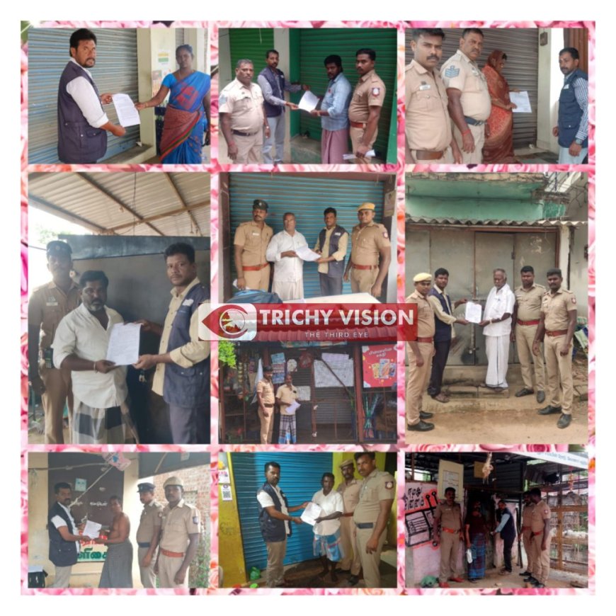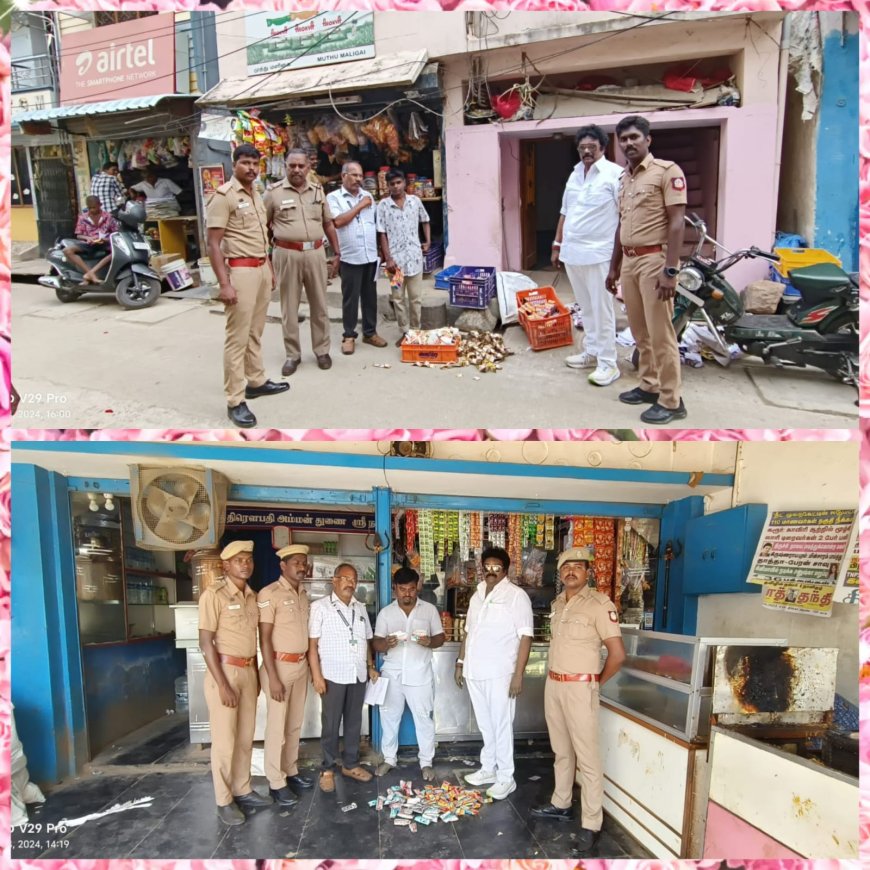 திருச்சிராப்பள்ளி மாவட்ட ஆட்சியர் M.பிரதீப்குமார் உத்தரவின் பேரில் காவல் துறை மூலமாக மாவட்ட பகுதியில் உள்ள காவல் நிலையங்களிலிருந்து பெறப்பட்ட பதிவு செய்யப்பட்ட முதல் தகவல் அறிக்கையின் அடிப்படையில், உணவு பாதுகாப்பு துறை மாவட்ட நியமன அலுவலர் ரமேஷ்பாபு வழிகாட்டுதலின் பேரில் மாவட்ட பகுதியில் உள்ள தடை செய்யப்பட்ட புகையிலை பொருட்களை விற்பனை செய்த கடைகள் அனைத்தும்