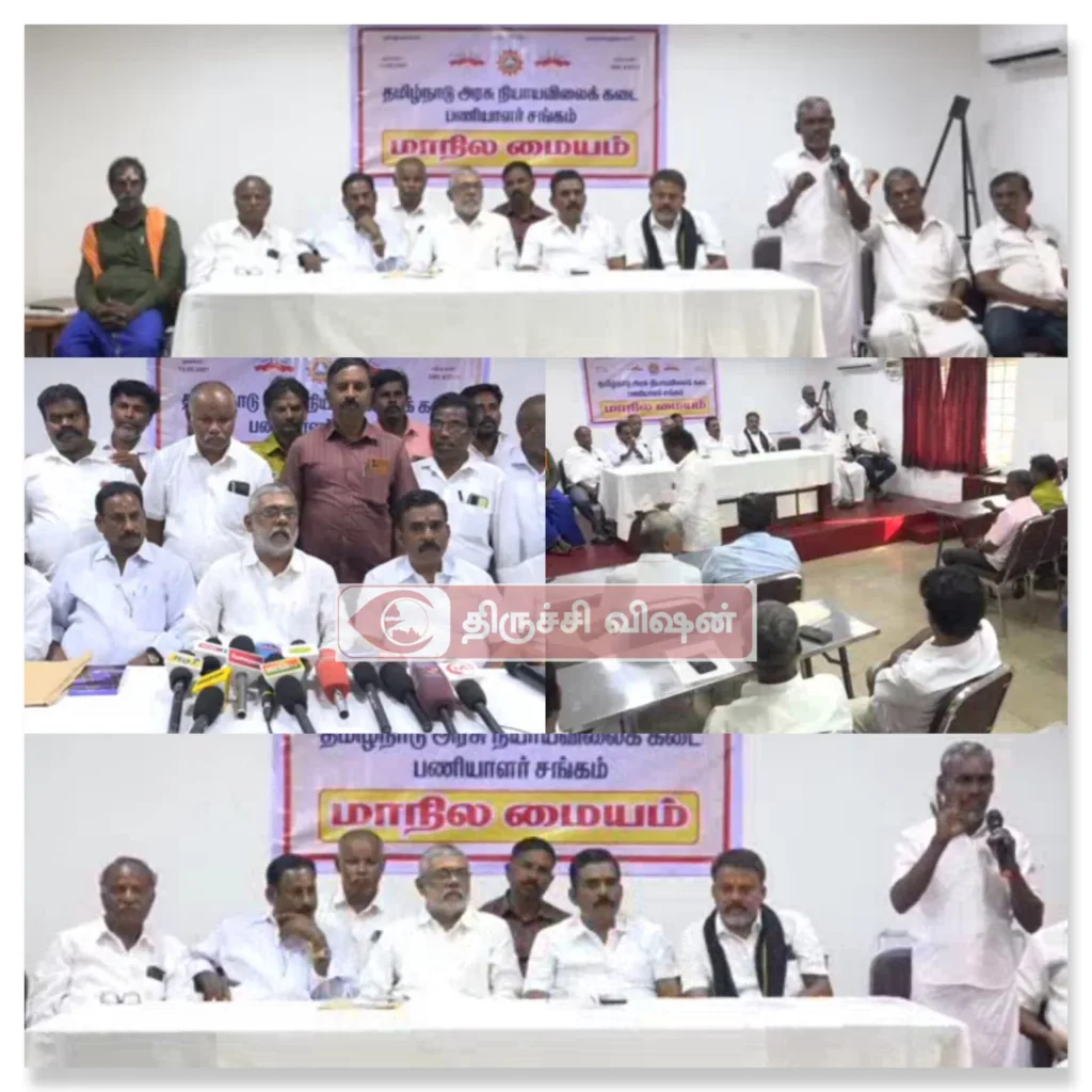 தமிழ்நாடு அரசு நியாய விலைக்கடை பணியாளர் சங்கம் சார்பில் திருச்சியில் இன்று உயர்மட்ட ஆலோசனைக் கூட்டம் மாவட்ட தலைவர் ரமேஷ் தலைமையில், செல்வமணி முன்னிலையில் நடைபெற்றது.