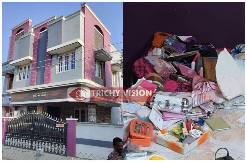 வீட்டை அருகிலுள்ள ஜெயராஜ் என்பவர் பராமரித்து வருகிறார். நேற்று இரவு ஜெயராஜ் வீட்டில் விளக்குகளை போட்டு விட்டு அதிகாலையில் வீட்டை வந்து பார்த்த போது வீட்டின் முன்பக்க கேட் உடைக்கப்பட்டு, வீட்டில் உள்ள 4 பீரோக்கள் உடைக்கப்பட்டு பொருட்கள் சிதறி கடந்தன. இதனையடுத்து மணப்பாறை காவல் துறையினருக்கு தகவல் தெரிவித்ததையடுத்து போலீசார் கைரேகை நிபுணர்கள், மோப்ப நாய் உதவியுடன் விசாரணை மேற்கொண்டு வருகின்றனர்.