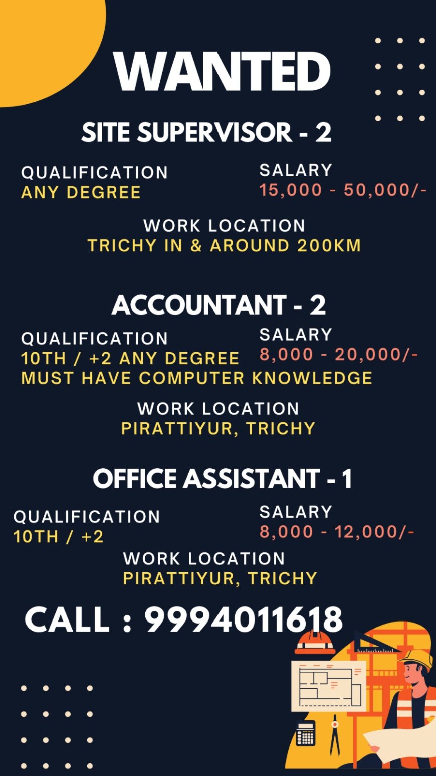 Job Opening – Wanted Site Supervisor, Accountant, Office Assistant @ Arudra Construction, Trichy
