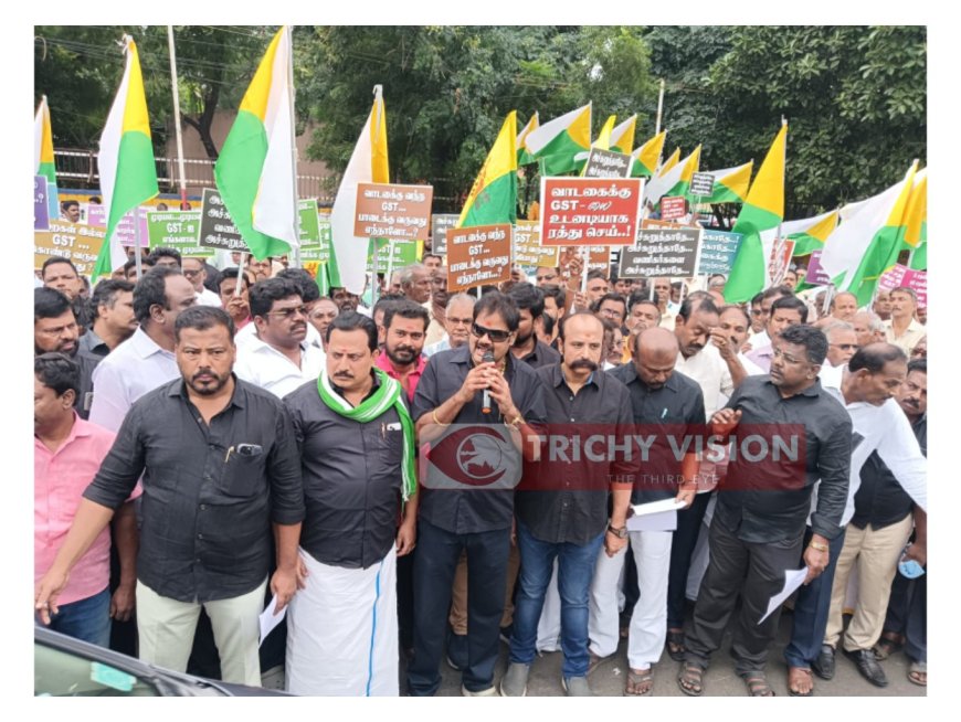 வணிக கட்டிடங்களுக்கு வாடகையுடன் சேர்த்து 18 சதவீதம் ஜிஎஸ்டிவரி என்ற மத்திய அரசின் அறிவிப்பிற்கு கண்டனம் தெரிவித்து தமிழ்நாடு வணிகர் சங்கங்களின் கூட்டமைப்பு சார்பாக திருச்சி பிஎஸ்என்எல் அலுவலகம் அருகில் மாநில பொதுச்செயலாளர் கோவிந்தராஜூலு தலைமையில் கண்டன ஆர்ப்பாட்டம் நடைபெற்றது.