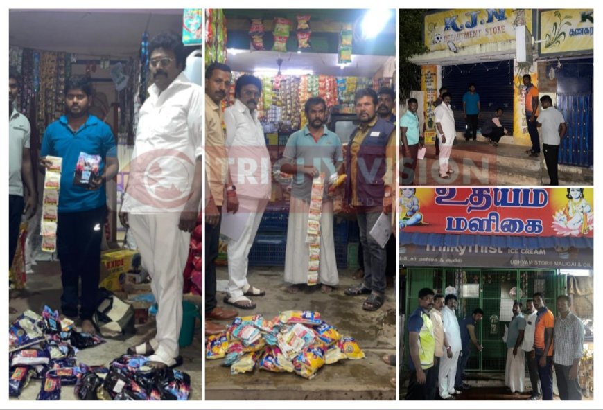மேலும் தமிழக அரசால் தடை செய்யப்பட்ட குட்கா மற்றும் புகையிலை பொருட்களை விற்பனைக்கு வைத்திருந்த குற்றத்திற்காக அந்த இரண்டு கடைகளும் சீலிடப்பட்டது. இந்த ஆய்வின்போது உணவு பாதுகாப்பு அலுவலர்களாகிய சையத் இப்ராஹிம், மகாதேவன், கந்தவேல் ஆகியோரும் மற்றும் ஆயுதப்படை காவலர்களும் உடனிருந்தனர்.