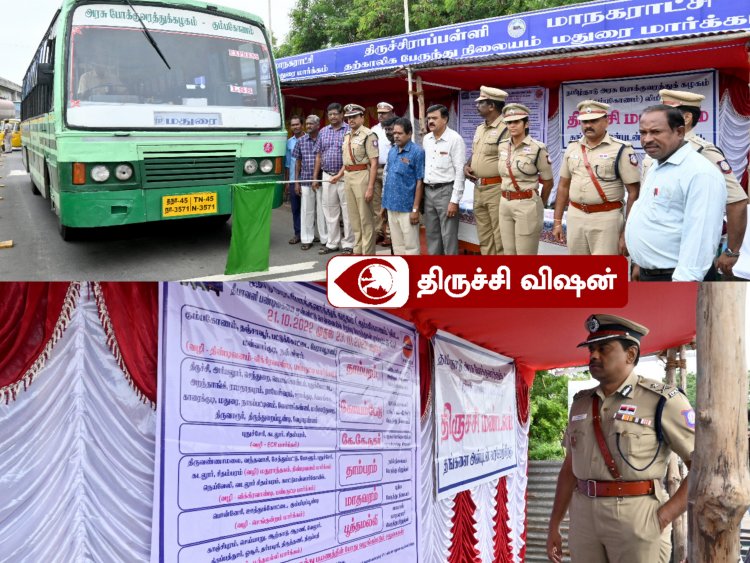 தீபாவளி பண்டிகை முன்னிட்டு போக்குவரத்து நெரிசிலை தவிர்க்கும் பொருட்டுபயணிகள் நலன் கருதியும் திருச்சி மாநகரில் 21.10.2022 முதல் 26.102022 வரை தஞ்சாவூர் புதுக்கோட்டை மற்றும் மதுரை மார்க்கமாக செல்லும் அனைத்து பேருந்துகளும் கீழ்கண்ட தற்காலிக பேருந்து நிலையங்களிலிருந்து இயக்கப்பட உள்ளது.
