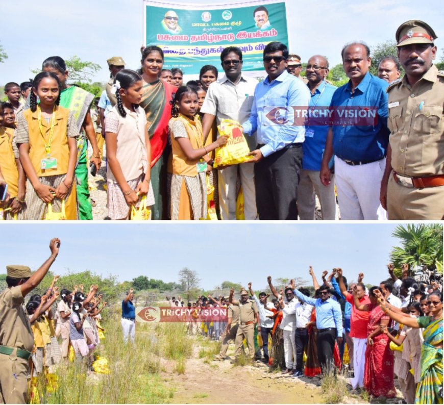 திருச்சி மாவட்டம், சிறுகனூர் அருகே எம்.ஆர்.பாளையம் காப்புக் காட்டில் மாவட்ட ஆட்சியரின் தலைமையில் பள்ளி மாணவ மாணவியர்கள் உதவியுடன் வனப்பகுதியில் நீர்நிலைகளின் அருகே விதைப்பந்துகள் தூவப்பட்டன. திருச்சி மாவட்டத்தில் தற்போது 10 சதவீத வனப்பரப்பு உள்ளது. இதனை 33 சதவீதமாக உயர்த்த தமிழ்நாடு பசுமை இயக்கம் சார்பாக தரமான மரக்கன்றுகள் உற்பத்தி செய்தல், நடுதல் உட்பட பல்வேறு பணிகள் நடைபெற்று வருகின்றன.