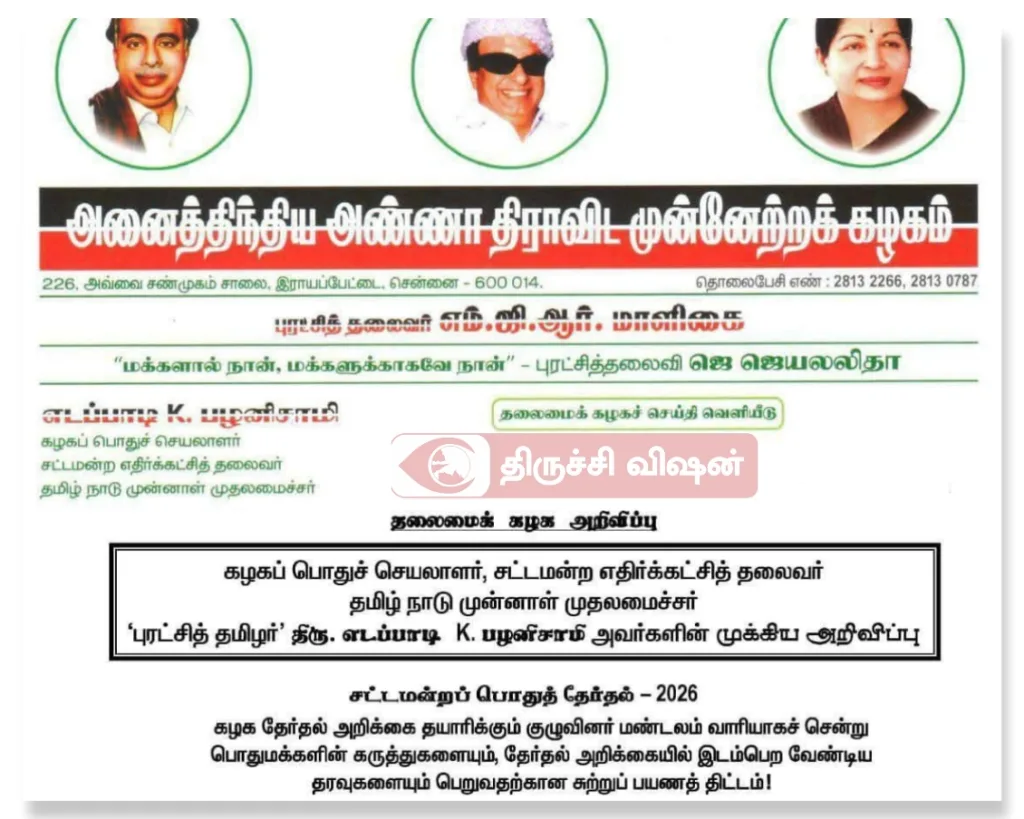 2026- சட்டமன்றத் தேர்தலை முன்னிட்டு, கழக தேர்தல் அறிக்கை தயாரிக்கும் குழு கூட்டம் வருகின்ற 08.01.2025 (வியாழக்கிழமை) அன்று மாலை 4:00 மணியளவில்.. திருச்சி காஜா நகரில் உள்ள VS. திருமண மகாலில்.. நடைபெற உள்ளது..