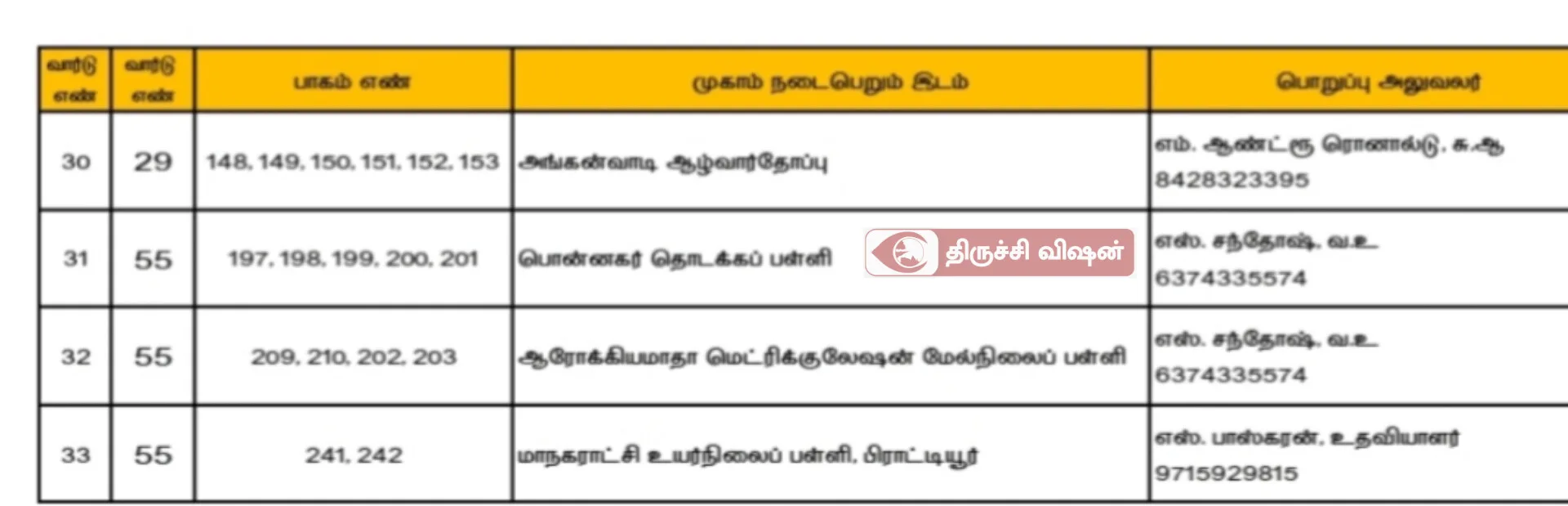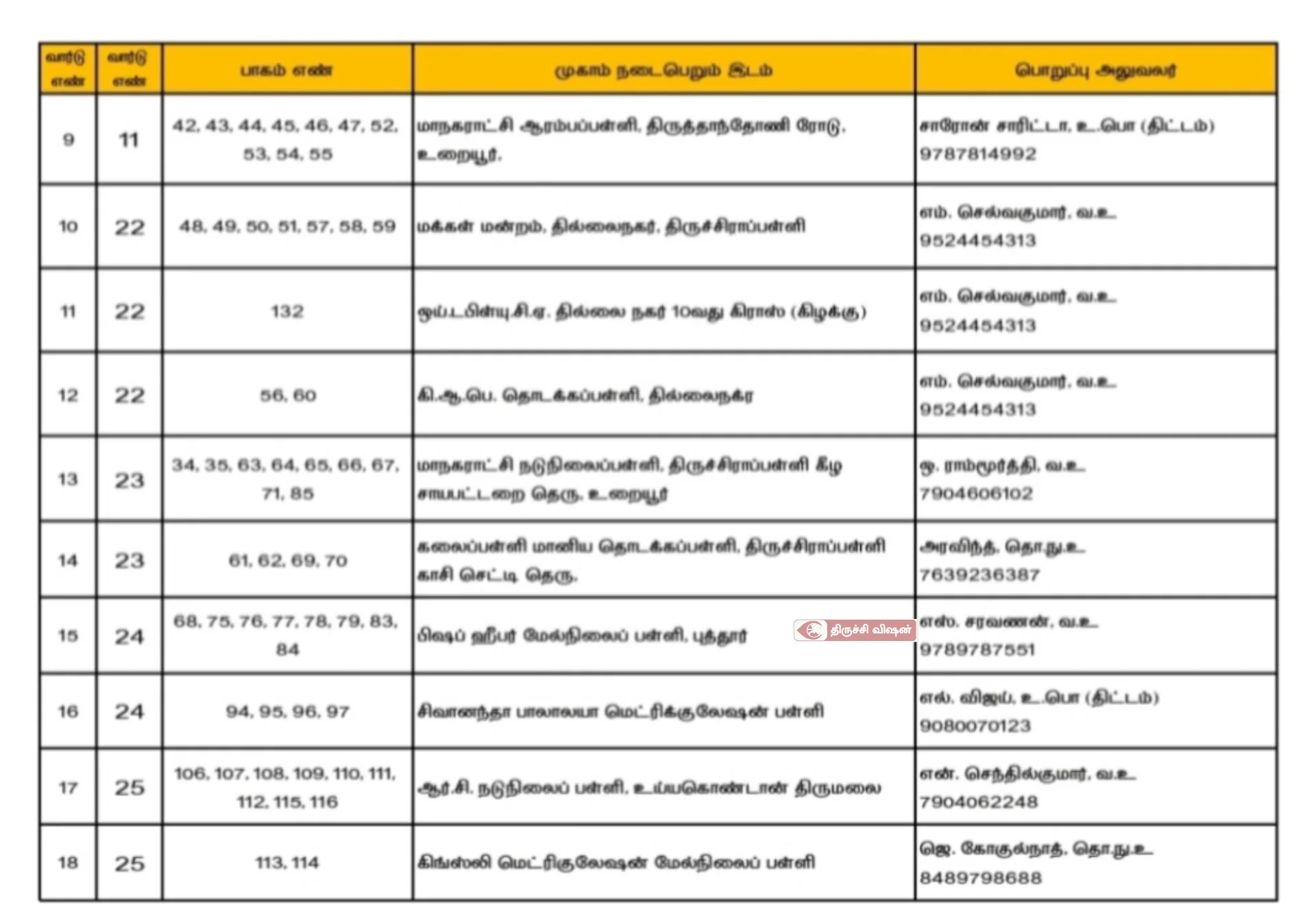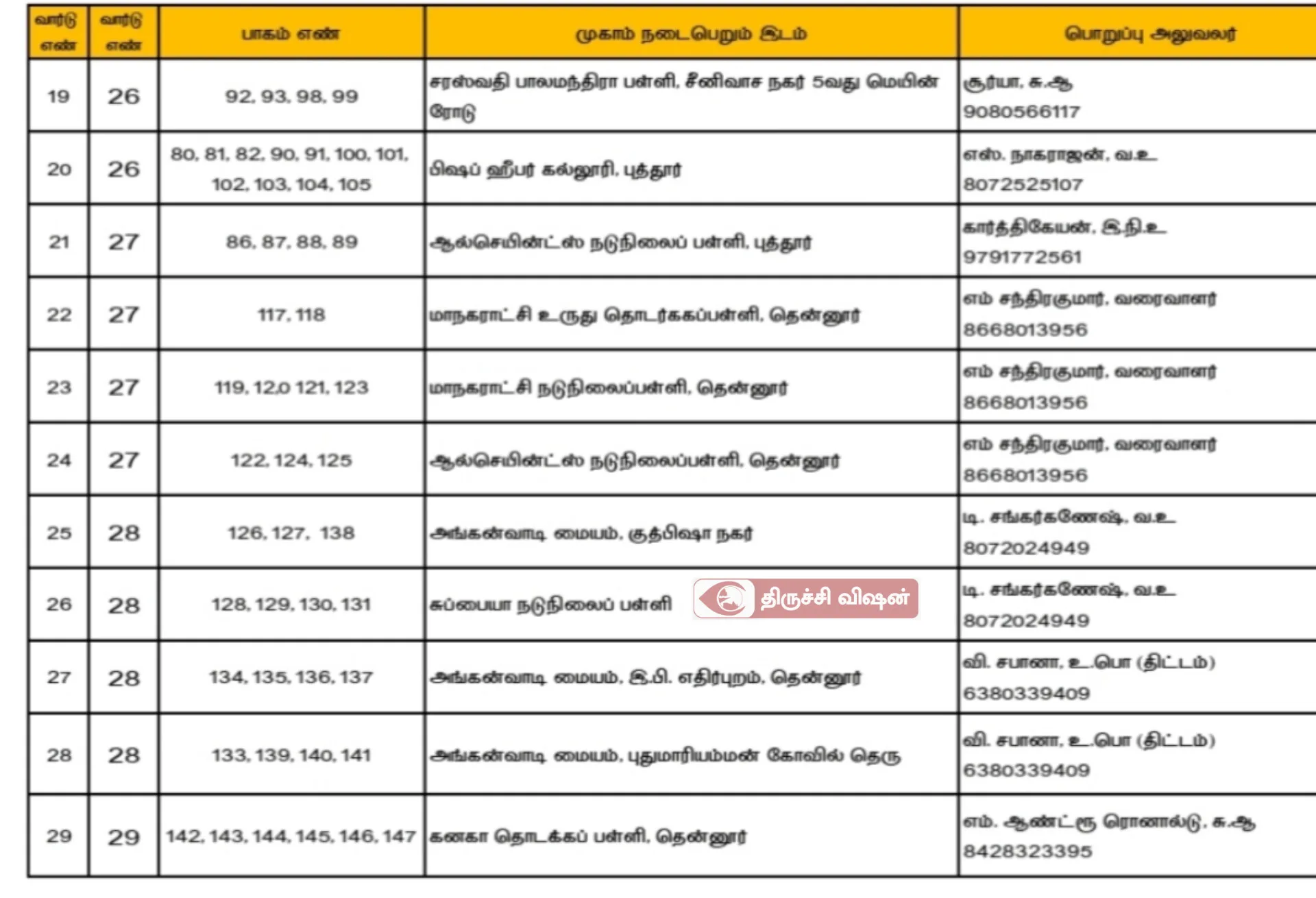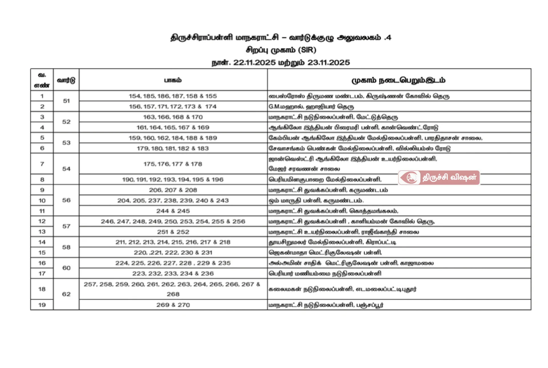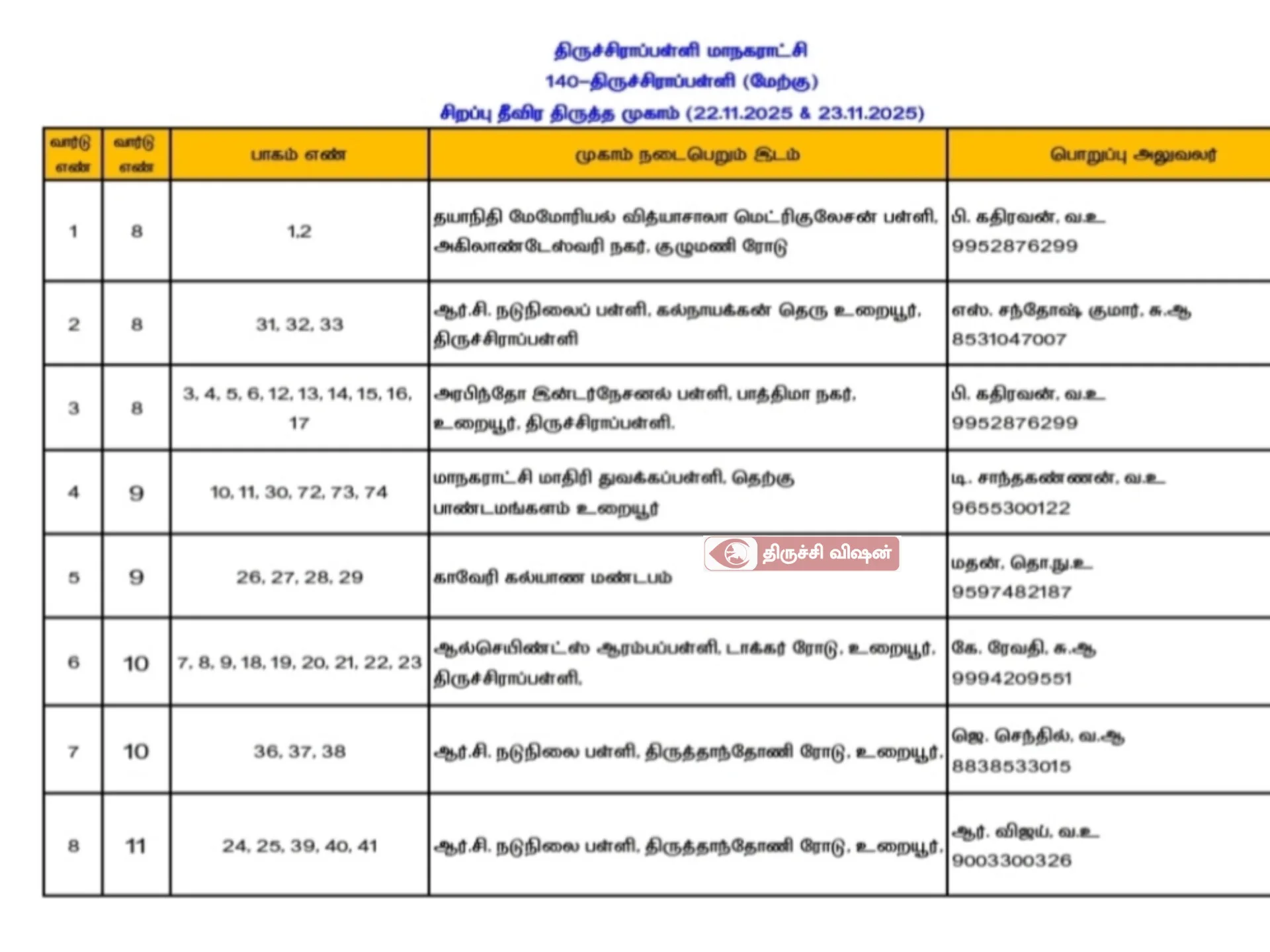 திருச்சிராப்பள்ளி மேற்கு சட்டமன்றத் தொகுதியில் 22.11.2025 மற்றும் 23.11.2025 ஆகிய தேதிகளி வாக்காளர் பட்டியல் சிறப்பு தீவிரத்திருத்தம், சிறப்பு உதவி முகாம் நடைபெறுகிறது மாநகராட்சி ஆணையர் லி. மதுபாலன், அவர்கள் தகவல்.இந்திய தேர்தல் ஆணையத்தின் உத்தரவின்படி 01.01.2026 -ஐத் தகுதி ஏற்பு நாளாகக் கொண்டு தகுதியுள்ள நபர்கள் எவரும் வாக்காளர் பட்டியலில் விடுபடவில்லை என்பதையும், தகுதியற்ற நபர்கள் யாரும் வாக்காளர் பட்டியலில் சேர்க்கப்படவில்லை என்பதையும் உறுதி செய்யும் பொருட்டு, திருச்சிராப்பள்ளி மாநகராட்சிக்குட்பட்ட வார்டுகளில் 04.11.2025 அன்று முதல் சிறப்பு தீவிரத்திருத்த பணி தொடங்கி நடைபெற்று வருகிறது.சிறப்பு தீவிர திருத்தம், 2026 தொடர்பாக வாக்காளர்களுக்கு வழங்கப்பட்டுள்ள கணக்கிட்டு படிவங்களை பூர்த்தி செய்வது தொடர்பான சந்தேகங்களை நிவர்த்தி செய்திடும் பொருட்டு, திருச்சிராப்பள்ளி மேற்கு சட்டமன்ற தொகுதியில் உள்ள அனைத்து வாக்குச்சாவடி அமைவிடங்களிலும் உதவி மையங்கள் அமைக்கப்பட்டு, எதிர்வரும் 22.11.2025 மற்றும் 23.11.2025 ஆகிய தேதிகளில் காலை 10:00 மணி முதல் மாலை 05:00 மணி வரை செயல்படவுள்ளது.