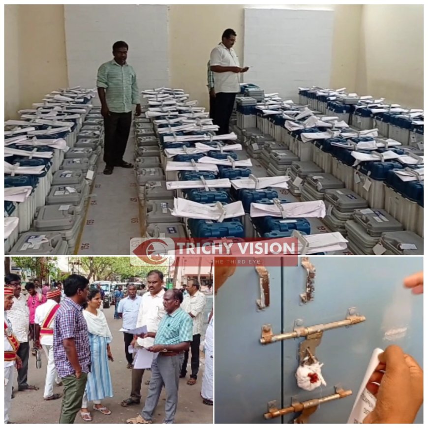 திருச்சி நாடாளுமன்ற தேர்தல் நடைபெற்ற வாக்குப் பெட்டிகள் வாக்கு என்னும் மையத்தில் வைத்து சீல் வைக்கப்பட்டது. தமிழகத்தில் நேற்று ஒரே கட்டமாக 18வது நாடாளுமன்ற தேர்தல் காலை 07:00 மணிக்கு துவங்கி மாலை 06:00 மணிக்கு முடிவுற்றது. இதனை தொடர்ந்து திருச்சியில் உள்ள வாக்குச்சாவடியில் பயன்படுத்தப்பட் மின்னணு வாக்கு இயந்திரங்கள் விவி பட் சீல் வைக்கப்பட்டு வாக்குச்சாவடியில் இருந்து வாக்கு எண்ணிக்கை மையமான ஜமால் முகமது கல்லூரிக்கு கொண்டு வரப்பட்டு கட்டுப்பாட்டு இயந்திர அறையில் வைக்கப்பட்டது .