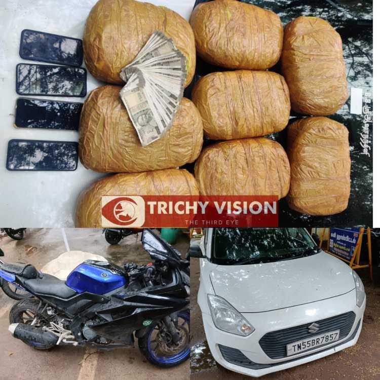 திருச்சி மாநகரம் பாலக்கரை காவல்நிலைய எல்லைகுட்பட்ட சங்கிலியாண்டபுரம் சர்வீஸ்ரோடு பாலத்தின் கீழ் இளைய தலைமுறையினரை சீரழிக்கும் வகையில் கஞ்சாவை விற்பனை செய்வதாக காவல் ஆய்வாளருக்கு கிடைத்த ரகசிய தகவலின்பேரில் ரோந்து சென்றபோது, TN 55 BR 7857 Maruthi Swift Car மற்றும் பதிவு எண் இல்லாத R15 Yamaha இருசக்கர வாகனத்தில் பெரிய மூட்டையுடன் சந்தேகம்படும்படியாக நின்றுக்கொண்டிருந்தவர்களை பிடித்து விசாரணை செய்தனர்.