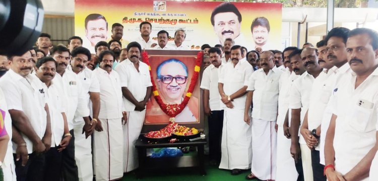 பேராசிரியர் க.அன்பழகன் 2 ஆம் ஆண்டு நினைவு தினத்தை முன்னிட்டு திருச்சி தில்லைநகர் சாஸ்திரி ரோட்டில் உள்ள தி.மு.க. முதன்மைச் செயலாளர் அலுவலகத்தில் நகராட்சி நிர்வாக துறை அமைச்சர் கே.என்.நேரு தலைமையில் பேராசிரியரின் உருவப் படத்திற்கு தி.மு.க.வினர் மலர்தூவி அஞ்சலி செலுத்தினர்.