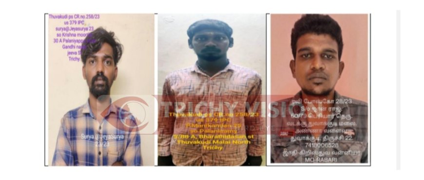 திருச்சி மாவட்டம், துவாக்குடி காவல் நிலைய எல்லைக்குட்பட்ட NIT Amber Hostel அருகில், கடந்த (19.11.2023)-ம் தேதி Hostel மாணவரிடமிருந்து சுமார் 3 பவுன் நகையை திருடி சென்றது தொடர்பாக, துவாக்குடி காவல் நிலைய குற்ற எண். 258/23 U/s 379 IPC வழக்கு பதிவு செய்யப்பட்டது.
