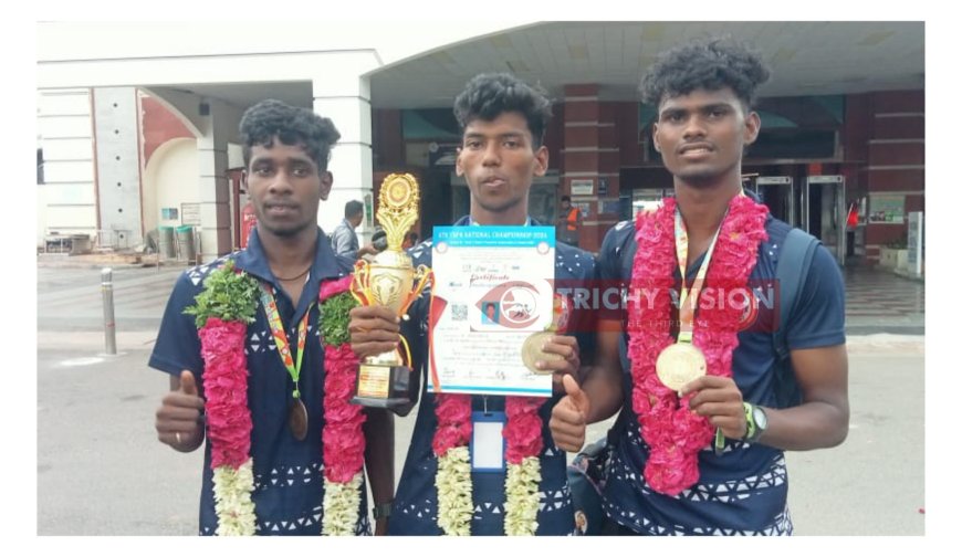 இதில் தமிழ்நாடு சார்பில் திருச்சி மாவட்டத்தில் இருந்து 3 வீரர்கள் தடகள போட்டியில் கலந்து கொண்டு தங்கப்பதக்கம் வென்று சாதனை படைத்தனர். இதில் லால்குடி பகுதியை நேர்ந்த அவினேஷ்குமார் (20) 5 ஆயிரம் மீட்டர் ஓட்டப்பந்தையத்தில் முதல் இடமும், திருவெறும்பூர் பகுதியை சேர்ந்த அருண்குமார் (20) 800 மீட்டர் ஓட்டப்பந்தையத்தில் முதல் இடமும், சமயபுரம் பகுதியை சேர்ந்த ஜெயசூர்யா (18) 3 ஆயிரம் மீட்டர் ஓட்டப்பந்தையத்தில் முதல் இடம் பெற்று தங்கப்பதக்கம் பெற்றனர்.