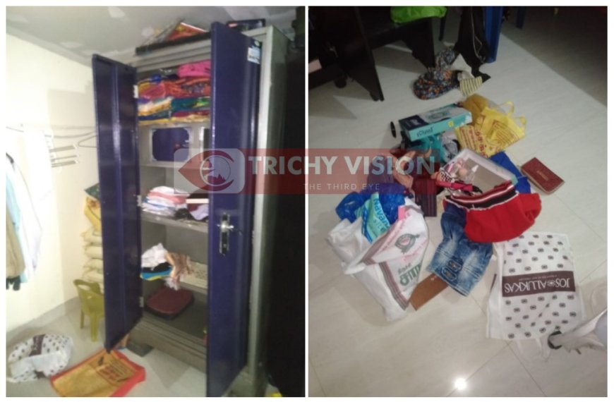 இதனை தொடர்ந்து இன்று காலை ராஜ்குமார் மட்டும் வீட்டிற்கு வந்து பார்த்த பொழுது வீட்டின் முன்பக்க கதவுகளில் இருந்த இரண்டு பூட்டுகள் உடைக்கப்பட்டு பின்னர் வீட்டின் உள்ளே சென்று பார்த்த பொழுது வீட்டிற்குள் உள்ளே இருந்த மூன்று பீரோக்கள் திறந்து அலங்கோலமாக கடந்துள்ளது. அங்கு உள்ள டேபிள் டிராயர் லாக்கர் உடைக்கப்பட்டுள்ளதை கண்டு அதிர்ச்சி அடைந்தார். உடனடியாக இச்சம்பவம் குறித்து ராஜ்குமார் துவாக்குடி போலீசாருக்கு தகவல் கொடுத்தார். அதன் அடிப்படையில் சம்பவ இடத்திற்கு துவாக்குடி போலீசார் விரைந்து வந்து பார்வையிட்டனர். மேலும் மோப்பநாய் காவேரி வரவழைக்கப்பட்டு சோதனை செய்து வீட்டிலிருந்து சிறிது தூரம் ஓடி நின்றது.