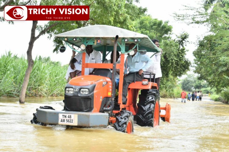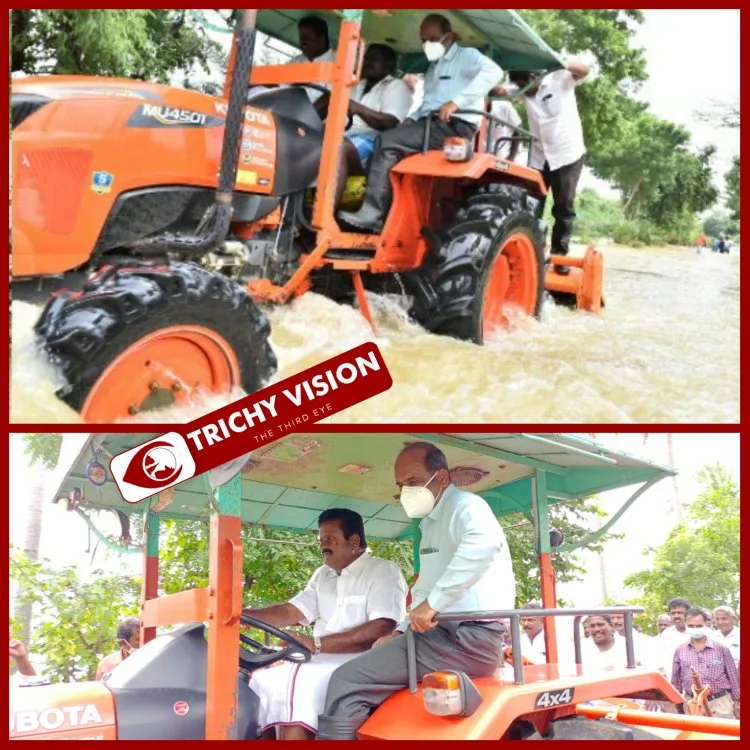 இந்நிலையில் அப்பகுதிக்கு ஆய்வு மேற்கொள்ள திருச்சி மாவட்ட ஆட்சியர் சிவராசு ,கோட்டாட்சியர் வைத்தியநாதன் உள்ளிட்ட அதிகாரிகள் முதலில் டிராக்டரில் ஆய்வு செய்தனர். அதன் பிறகு லால்குடி சட்டமன்ற உறுப்பினர் சௌந்தரபாண்டியனும் நேரில் வந்தவுடன் எம்.எல்.ஏ டிராக்டரை  ஓட்ட மாவட்ட ஆட்சியர் சிவராசும்  மட்டும் மழைநீர் பாதித்த பகுதிகளை ஆய்வு செய்தனர் .