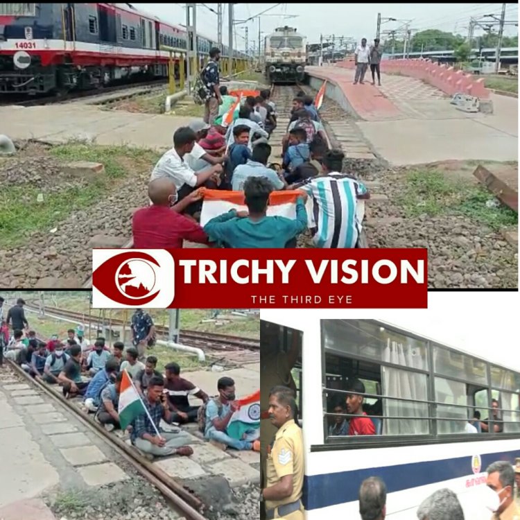 இதன் ஒருபகுதியாக திருச்சி ஜங்சன் ரெயில்நிலையத்தில் இன்று திருச்சியிலிருந்து சென்னை செல்லும் சோழன் ரெயில் பராமரிப்பு பணி காரணமாக 10 மணிக்கு மாற்றாக 12 மணிக்கு புறப்பட்டு சென்றது. அப்போது ரெயில்நிலையத்தில் வந்திருந்த பல்வேறு பகுதிகளைச் சேர்ந்த ரெயில்வே பணிக்குத் தேர்வாகிய இளைஞர்கள் மற்றும் பட்டதாரி இளைஞர்கள் 35 பேர் 4வது நடைமேடை ரெயில்வே தண்டவாளத்தில் தேசியக் கொடியுடன் அமர்ந்து அக்னிபாத் திட்டத்திற்கு எதிர்ப்பு தெரிவித்து ரெயில் மறியல் போராட்டத்தில் ஈடுபட்டனர்.