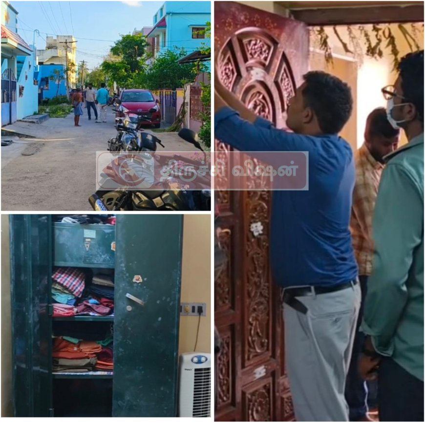 திருச்சி நம்பர் ஒன் டோல்கேட் அருகே உள்ள பாலாஜி நகரை சேர்ந்தவர் ஸ்ரீதர் (55). இவர் திருச்சி மாநகராட்சியில் ஊழியராக வேலை பார்த்து வருகிறார்.இந்நிலையில் ஸ்ரீதர் வீட்டை பூட்டிவிட்டு வேலைக்கு சென்றுவிட்டார். வெளியூருக்கு சென்றிருந்த ஸ்ரீதரின் மனைவி முத்துச்செல்வி(50) வீட்டிற்கு திரும்பி வந்து பார்த்தபோது வீட்டின் முன்பக்க கதவு உடைக்கப்பட்டு கிடந்ததை கண்டு அதிர்ச்சி அடைந்தார்.