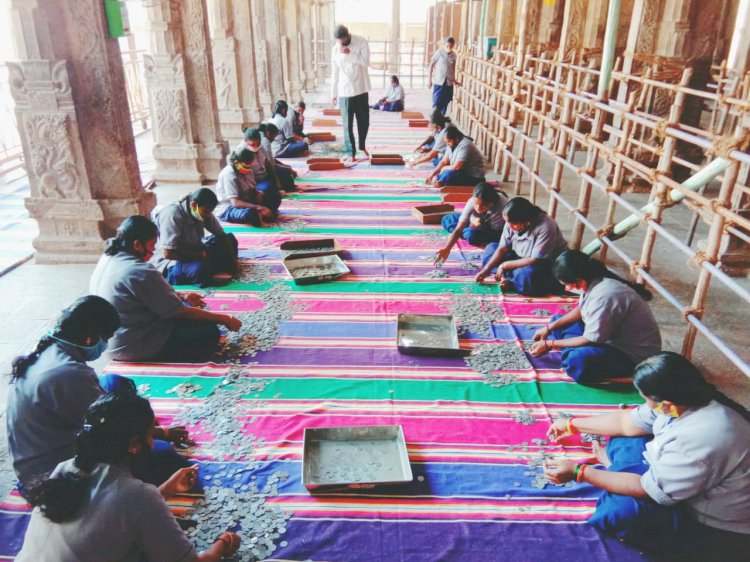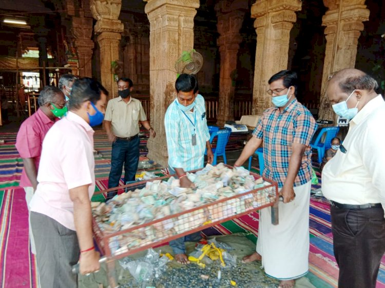 ஸ்ரீரங்கம் அரங்கநாத சுவாமி திருக்கோயில் இன்று மாதாந்திர உண்டியல்கள் திறக்கப்பட்டு பக்தர்களின் காணிக்கைகள் சமூக இடைவெளியுடன் கோவிலின் இணை ஆணையர் ஜெயராமன் தலைமையில் அறநிலையத் துறை ஊழியர்கள் 50க்கும் மேற்பட்டோர் இணைந்து காணிக்கைகளை எண்ணினர்.
