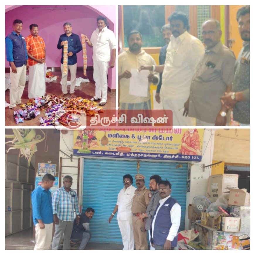 திருச்சிராப்பள்ளி முத்தரசநல்லூர் பகுதியில் உள்ள அங்காளம்மன் மளிகை மற்றும் கம்பரசம்பேட்டை பகுதியில் உள்ள SM டிரேடர்ஸ் என்ற இரண்டு கடைகளிலும் தமிழக அரசால் தடைசெய்யப்பட்ட புகையிலை பொருட்களை விற்பனை செய்து வந்ததினால்,