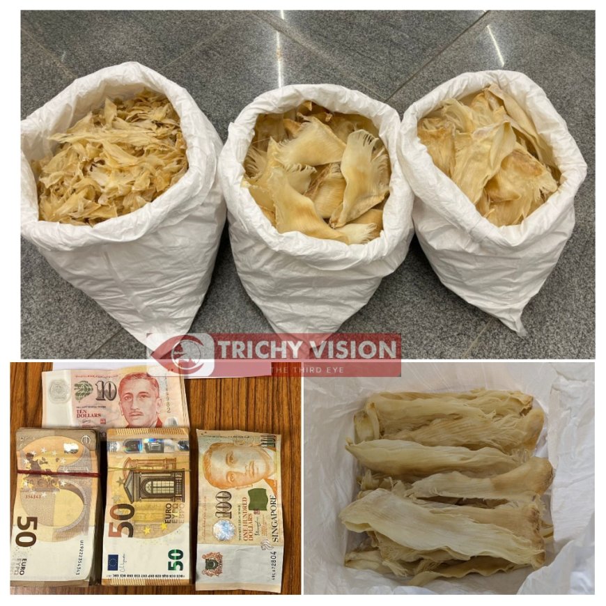இந்த நிலையில் திருச்சி விமான நிலையத்திலிருந்து ஏர் இந்தியா விமான மூலம் சிங்கப்பூருக்கு செல்ல இருந்த பயணிகளை சுங்கத்துறை அதிகாரிகள் சோதனை செய்தனர். ஒரு பயணியிடம் சுறா மீன் துடுப்புகள் மற்றும் யூரோ, சிங்கப்பூர் டாலர்கள் இருந்தது கண்டுபிடிக்கப்பட்டது.