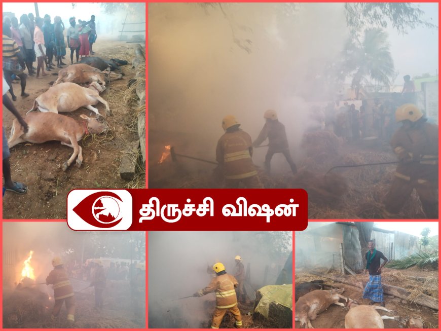 இந்நிலையில் இன்று மாலை கடுமையான மழை மற்றும் இடி மின்னலுடன் பெய்தது .இந்த இடியில் ராஜீவ் காந்தி வீட்டில் அருகே கட்டி இருந்த பசு மாடுகள் மீது இடி விழுந்ததில் நான்கு மாடுகளும் சம்பவ இடத்திலேயே உயிரிழந்தன. இந்நிலையில் இடி அருகில் உள்ள தென்னை மரத்தில் விழுந்து தென்னை மரம் தீப்பற்றி எரிந்ததில் அதே பகுதியைச் சேர்ந்த பாலமுருகன் என்ற விவசாயிக்கு சொந்தமான 3 ஏக்கர் வைக்கோல் போரும் தீயில் எரிந்து நாசமானது.