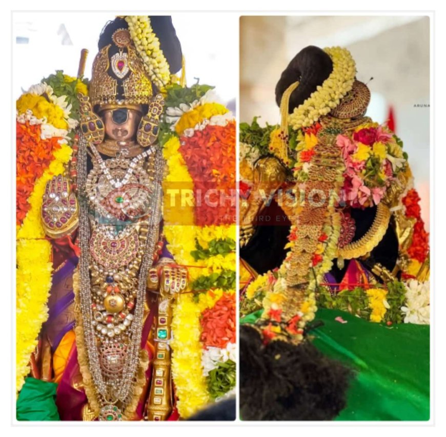 (இடது திருக்கை); பங்குனி உத்திர பதக்கம்; அதன் மேல் வைர ரங்கூன் அடிக்கை; சந்திர ஹாரம்; வரிசையாக வெள்ளை கல் – சிகப்புக் கல் அடுக்கு பதக்கங்கள்; நெல்லிக்காய் மாலை; தங்க பூண் பவழ மாலை, 8 வட (18 பிடி) முத்து சரம் அணிந்து; பின்புறம் – காசு மாலை, ஜடை அணிந்து; அதன் மேல் கல் இழைத்த ஜடை தாண்டா அணிந்து;