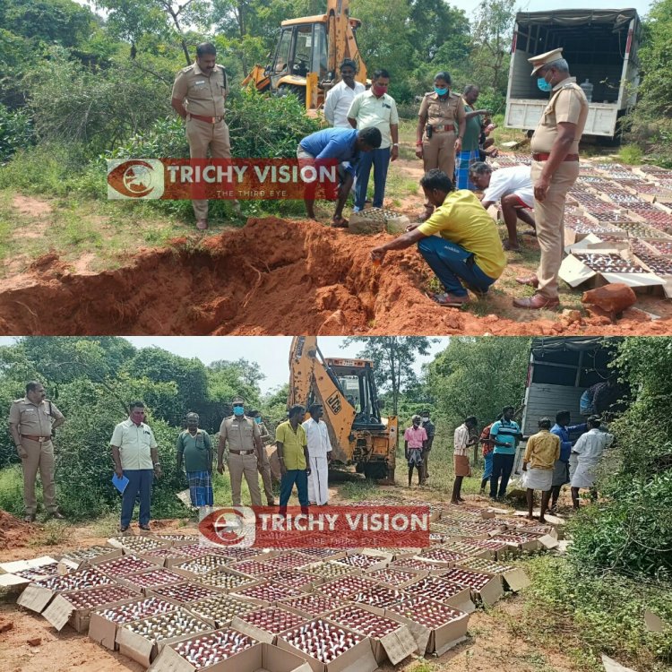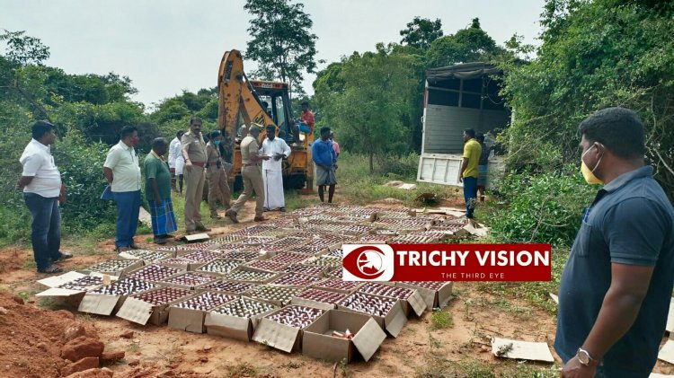 பறிமுதல் செய்த போலி மதுபானங்களை சிறுகனூர் அருகேயுள்ள தச்சங்குறிச்சி வன பகுதியில் மதுவிலக்கு டிஎஸ்பி முத்தரசு தலைமையில் திருச்சி மாவட்ட கலால் உதவி ஆணையர் வைத்தியநாதன் மேற்பார்வையில் தரையில் ஊற்றி அழித்தனர். திருச்சி மாவட்டம் சமயபுரம் அருகே இருங்களூர் ஊராட்சியில் உள்ள தெற்கு இருங்களூரில் போலி மதுபான பாட்டில்களை சட்டவிரோதமாக பதுக்கி வைத்து விற்பனை செய்வதாக திருவரம்பூர் மதுவிலக்கு போலீசாருக்கு ரகசிய தகவல் கிடைத்தது.