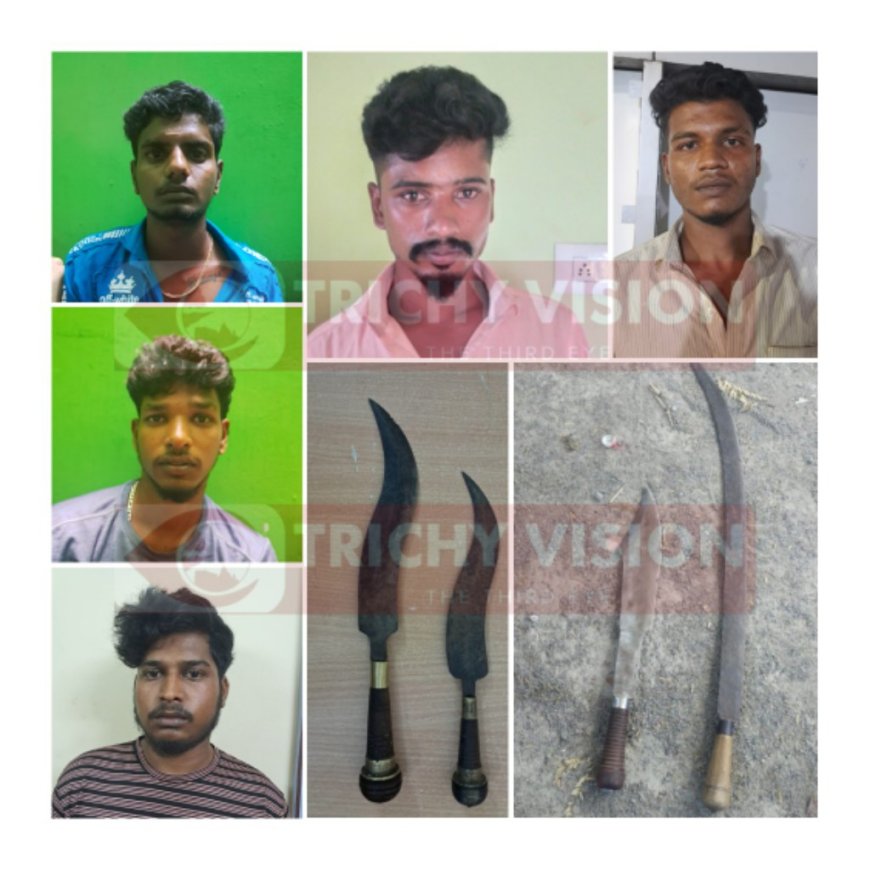 மேலும் அவர்களிடமிருந்து கத்தி, அரிவாள், கம்பு என பயங்கர ஆயுதங்களை போலீசார் பறிமுதல் செய்தனர். இதையடுத்து, ஸ்ரீரங்கம் கொள்ளிடம் சாலையைச் சேர்ந்த விக்னேஷ்வரன் (21), கீழக்கல்கண்டார்கோட்டை ஆலத்தூரைச் சேர்ந்த சரண்குமார் (23), அதவத்தூரைச் சேர்ந்த அரவிந்த், மேலக்கல்கண்டார் கோட்டையைச் சேர்ந்த விஜய் (20), ராம்பிரசாத் (21) ஆகிய 5 பேர் மீதும் பொன்மலை போலீசார் வழக்குப்பதிவு செய்து, அவர்கள் ஐந்து பேரையும் கைது செய்து சிறையில் அடைத்தனர்.