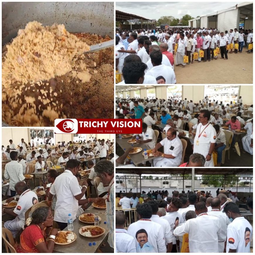 இந்த நிகழ்ச்சியில் கலந்து கொண்ட 30000 பேருக்கு மட்டன் பிரியாணி ,சிக்கன் 65, முட்டை, ஆனியன், தால்சா, தயிர் சாதம் மதிய உணவாக சுவையான உணவை திமுக முதன்மைச் செயலாளரும் நகராட்சி நிர்வாகத் துறை அமைச்சருமான நேரு ஏற்பாடு செய்து விருந்து அளித்து அசத்தினார்.