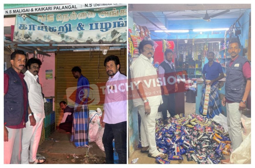 மேலும் பறிமுதல் செய்யபட்ட தமிழக அரசால் தடை செய்யப்பட்ட புகையிலை பொருட்களையும், சுடலைமனி என்பவரையும் மேல்நடவடிக்கைக்காக திருச்சிராப்பள்ளி மாநகர பொன்மலை காவல் நிலையத்தில் ஒப்படைக்கப்பட்டது. இந்த ஆய்வின்போது உணவு பாதுகாப்பு அலுவலர்களாகிய திரு. கந்தவேல், இப்ராஹிம், மகாதேவன் ஆகியோரும் உடனிருந்தனர்.