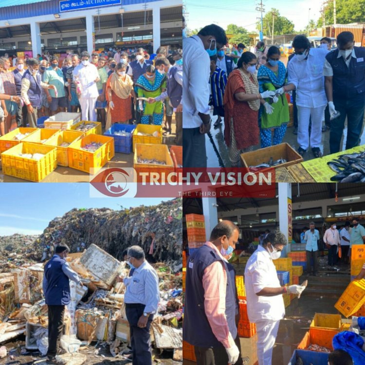 திருச்சி உறையூர் லிங்கம் நகரில் உள்ள மீன் மார்க்கெட்டை உணவு பாதுகாப்பு மாவட்ட நியமன அலுவலர் டாக்டர் ரமேஷ் பாபு மற்றும் திருச்சி மாவட்ட மீன்வளத்துறை துணை இயக்குனர் சர்மிளா உதவி இயக்குனர் ரம்யா லட்சுமி ஆகியோர் தலைமையில் உணவு பாதுகாப்பு அலுவலர்கள் கொண்ட குழுவினர் திடீர் ஆய்வு செய்தனர்.