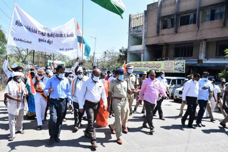 இந்திய சுதந்திரத்தின் 75ஆம் ஆண்டு கொண்டாடும் விதமாக மத்திய பேருந்து நிலையம் அருகில் உள்ள உப்பு சத்தியாகிரக நினைவு சின்னத்திலிருந்து  2 கி.மீ. தூரத்திற்கு நடைபயணம் தொடங்கி காந்தி மார்க்கெட் வரையும், காந்தி மார்க்கெட்டில் இருந்து கல்லூரி மாணவர்கள் மிதிவண்டி பயணத்தை தொடங்கி, தொடர்ந்து பெரிய கடைவீதி, என்.எஸ்.பி. சாலை, நந்திகோயில் தெரு, அண்ணாசாலை வழியாக காவிரி பாலம், மாம்பழச்சாலை, அம்மா மண்டபம் வழியாக ஸ்ரீரங்கம் ராஜகோபுரத்தை அடைந்து பின்னர் திருவானைக்காவல் வழியாக கொண்டயம்பேட்டை, திருவளர்ச்சோலை, கல்லணை வழியாக தஞ்சாவூர் மாவட்டம் வழியாக திருவையாறு, திருவாரூர் மாவட்டம் நீடாமங்கலம், நாகப்பட்டிணம் மாவட்டம் வேதாரண்யத்தில் 14.03.2021 அன்று உப்பு சத்தியாகிரக யாத்திரை முடிவடையும்.