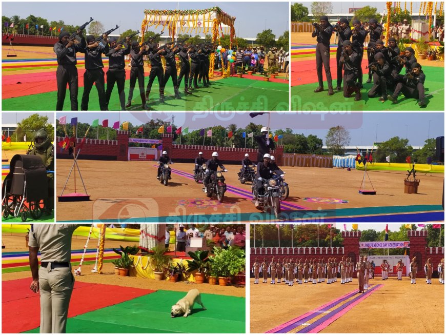 தமிழுக்கு பணிந்த மோப்பநாய் : வெடிபொருள்களை கண்டறிவது உள்ளிட்ட புலனாய்வுக்கு பயன்படுத்தப்படும் மேக்ஸ், டான், ராக்கி என்ற மூன்று மோப்பநாய்கள் தங்களது திறமையை மைதானத்தில் வெளிப்படுத்தியது. இதன் பயிற்சியாளர்கள் ஆங்கிலம் மற்றும் ஹிந்தி மொழிகளில் கொடுத்த கட்டளையை மட்டும் ஏற்று செயல்பட்டுவந்த மோப்பநாய்கள், இன்று தமிழ் மொழியில் கொடுக்கப்பட்ட உத்தரவுக்கு கீழ்ப்படிந்து நடந்துக்கொண்டு பார்வையாளர்களின் பாராட்டை பெற்றது. பின்னர், புல்லட் வீரர்கள், இரயில்வே பாதுகாப்பு படை பெண் வீராங்கனைகள் அதிநவீ ன துப்பாக்கிகளை கொண்டு சாகசங்களை நிகழ்த்தினர்.