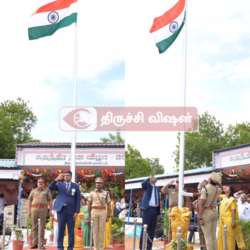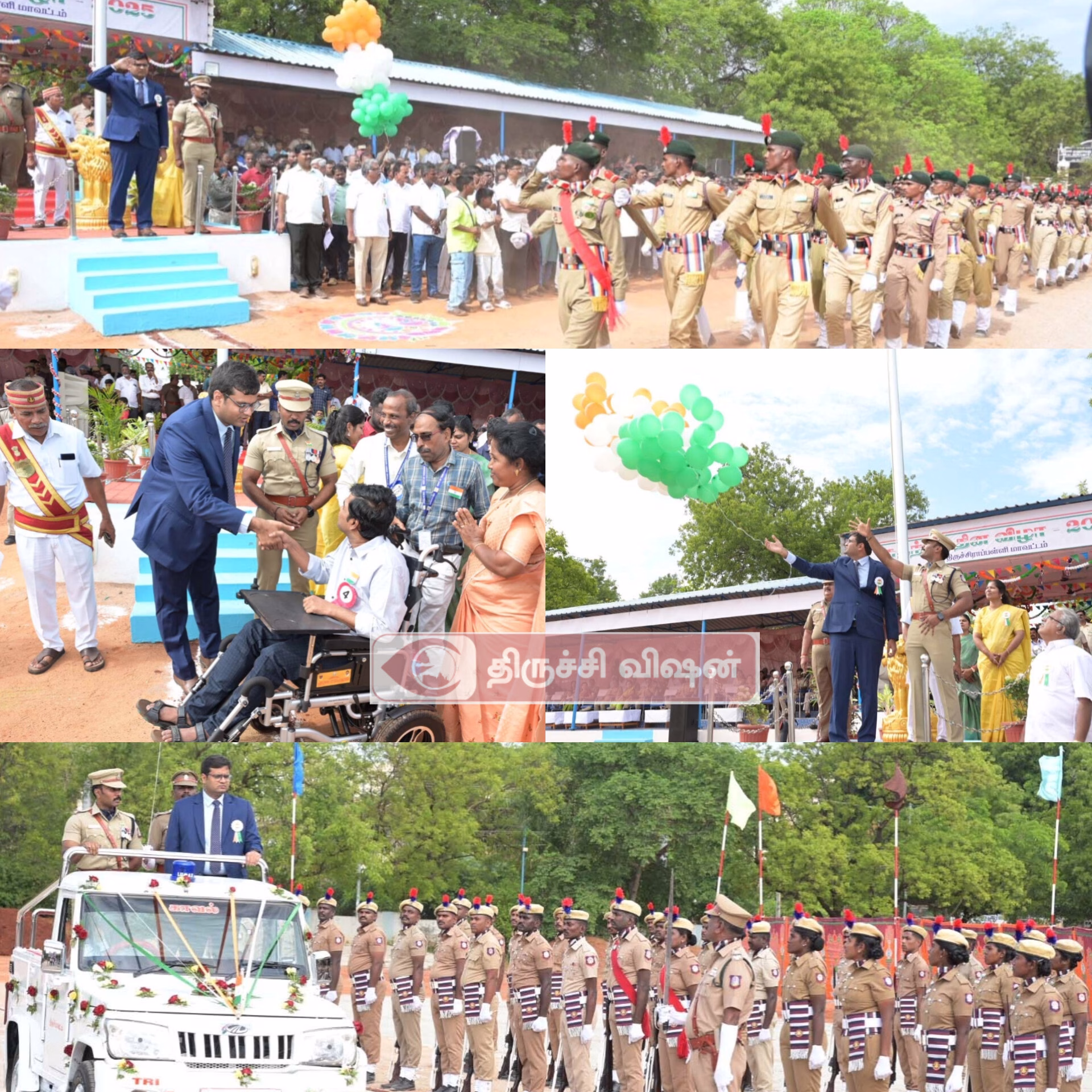 நாட்டின் 79வது சுதந்திர தின விழா திருச்சி மாவட்ட ஆயுதப்படை மைதானத்தில் கொண்டாடப்பட்டது. மாவட்ட ஆட்சியர் சரவணன் தேசிய கொடியினை ஏற்றி வைத்து, வண்ண பலூன்களை பறக்க விட்டார். இதனைத்தொடர்ந்து போலீசாரின் அணிவகுப்பினரை பார்வையிட்ட பின்பு அணிவகுப்பு மரியாதையை அவர் ஏற்றுக்கொண்டார். சுதந்திரப் போராட்ட தியாகிகள் குடும்பத்தினருக்கு பொன்னாடை போர்த்தி கௌரவித்தார்.