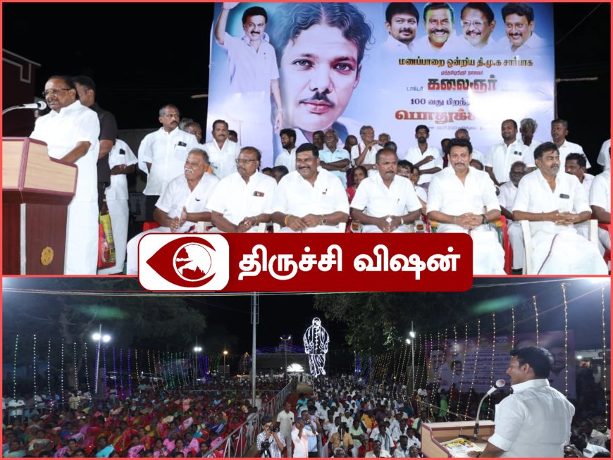 திருச்சி மாவட்டம் மணப்பாறை அருகே உள்ள சீகம்பட்டியில் மணப்பாறை ஒன்றிய செயலாளர் ராமசாமி தலைமையில் கலைஞரின் நூற்றாண்டு விழா பொதுக்கூட்டம் நடைபெற்றது. பள்ளிக்கல்வித்துறை அமைச்சர் அன்பில் மகேஷ் பொய்யாமொழி மற்றும் சட்டத்துறை அமைச்சர் ரகுபதி கலந்து கொண்டு சிறப்புரையாற்றினார்.
