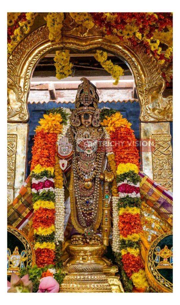 பின்புறம் – புஜ கீர்த்தி; அண்ட பேரண்ட பக்ஷி பதக்கம்; தாயத்து சரங்கள் கையில் சாற்றி; தங்க தண்டைகள் திருவடியில் அணிந்து சேவை சாதிக்கிறார்.